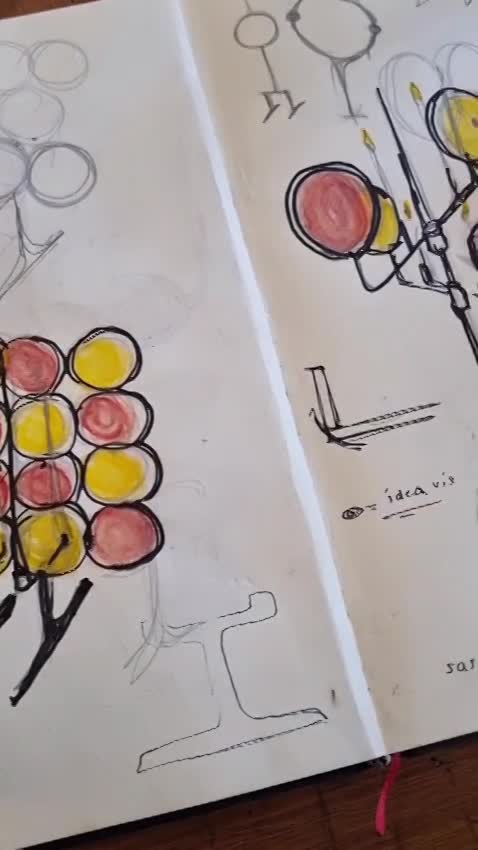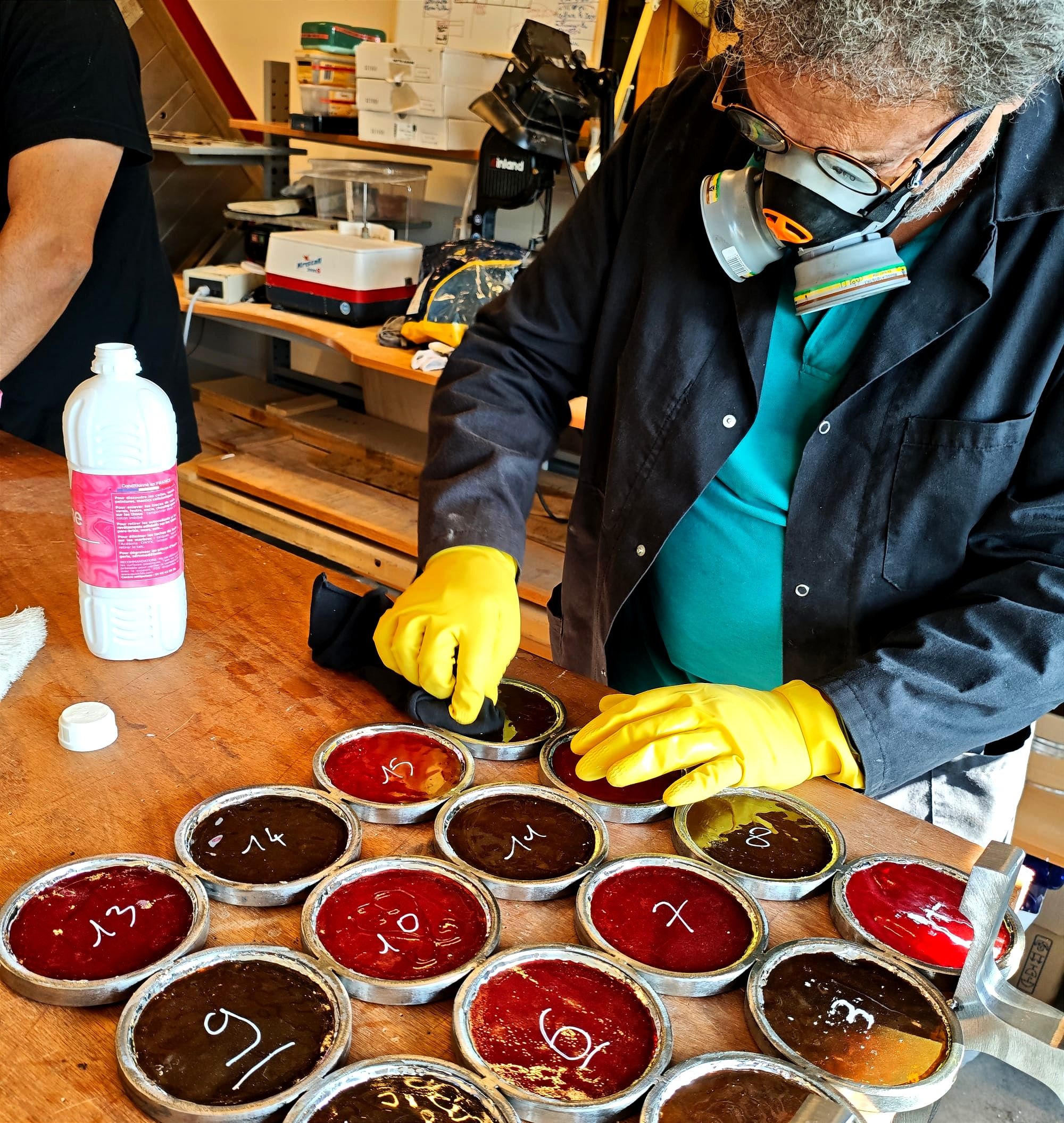Nous avons très vite éliminé les verres d’usine pour vitraillistes. Nous avons décidé de tester des techniques créatrices : mélanges de poudres de verre colorées et pigmentées, cuits sur des supports de verre blanc industriel. Ainsi, un verre créé est sorti du four, à la fois texturé et coloré - comme le designer l'avait imaginé. Puis, il a fallu trouver une solution afin de fixer les rondelles cuites aux structures d'acier. Nous avons donc choisi ensemble l’utilisation revisitée de la technique Tiffany, qui a consisté à sertir de cuivre verres et aciers, et à les souder à l'étain.