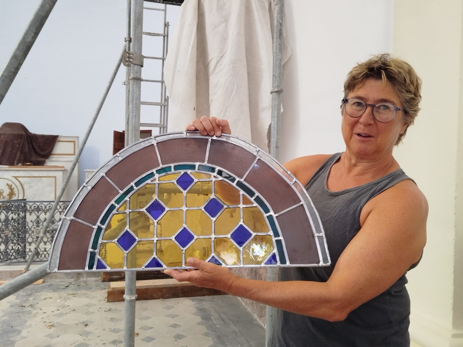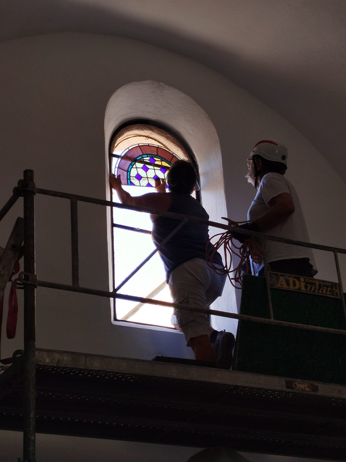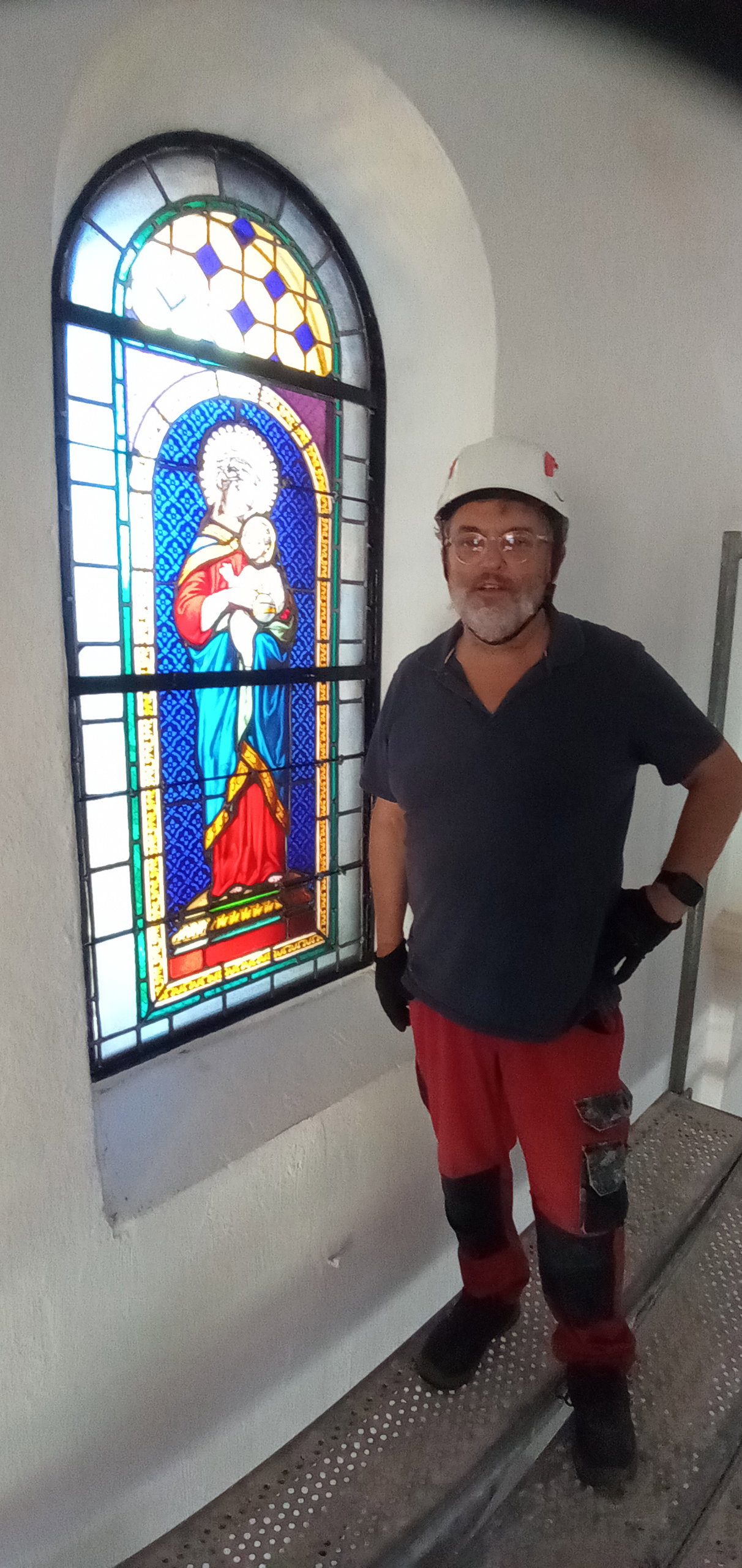 Eté 2025, restauration en association avec la vitrailliste Sylvaine TOSI, de deux vitraux du 19 ème siècle à la chapelle Saint-Roch (Sollies-Pont).